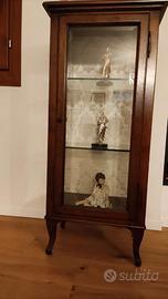 Vetrinetta Asola acquistata a Bassano del Grappa schienale rivestito in broccato bianco 2 ripiani in cristallo misure in cm H126 L56 P38 come nuova