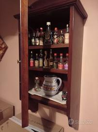 vetrinetta bacheca murale in arte povera adatta ad esposizione di oggetti .nel caso del nostro articolo è compresa di numero 15 bottigliette di liquori assortiti mignon anni 70 + brocca + soggetto riproduzione toto di San Gregorio armeno Napoli . dimensioni:altezza cm 70 //// larga cm40/// profonda 20.prezzo € 350.00