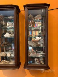 Due vetrine con 6 ripiani in vetro e fondo a specchio. Ideali per l’esposizione di oggetti da collezione. Le mensole e i montanti laterali sono in vetro ed il fondo è a specchio. Possono essere montate a parete perché dotate di ganci oppure impilate a colonna, grazie alla base d’appoggio.