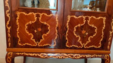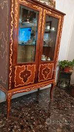 Vetrinetta in legno con ante in vetro. Decorazione crema su fondo marrone.
