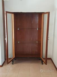 Regalasi vetrinetta-cristalliera vintage realizzata in legno, caratterizzata da due ante in vetro e con ripiani interni anch’essi in vetro.