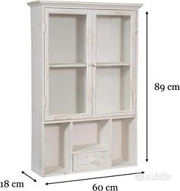 Con dimensioni di 89x60x18 cm, questa vetrinetta da parete è un'opzione salvaspazio ideale, offrendo un'ampia capacità interna senza ingombrare. Il vano inferiore con cassetto aggiunge un'ulteriore possibilità di organizzazione personalizzata.