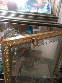 cornici in legno dorato. Composto da servante a due ante a due ripiani interni e sopralzo a due ante con tre ripiani disponibili. Fondi a specchio. Piedi a vite. Con chiave .