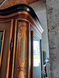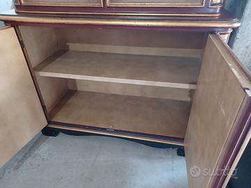 Splendida ed Elegante vetrinetta in legno con decori in stile floreale e foglia d'oro. Originale ed eccentrica è dotata bella parte superiore di tre ripiani con fondo in velluto bordeaux e tetto a motivi ad onda.