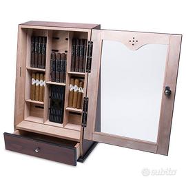 Humidor vetrina con pratico cassetto porta accessori. Igrometro e sistema di umidificazione. Dotato di chiusura con chiave. Scomparti verticali fissi, orizzontali di differenti misure. Capacità 70/90 sigari.