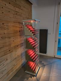 Vendo elegante vetrinetta Ikea in vetro con illuminazione integrata, misure 46x36x163 cm, personalizzata con scalette espositive artigianali in legno rivestite in velluto rosso stile gioielleria ideali per collezioni, modellini o profumi, in ottime condizioni e con ritiro esclusivamente a mano