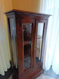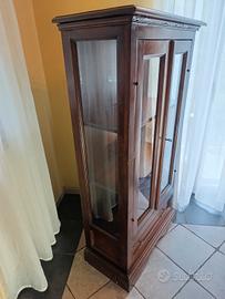Elegante vetrinetta in arte povera composta da tre ripiani in legno ed un cassetto alla base. Ante frontali e fianchi vetrati. Colore noce . Larghezza 79,5 cm