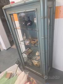 Vetrina in finto bambù smaltato, distile vintage o coloniale. La sua struttura è in legno laccato di un colore azzurro/grigio che imita le canne di bambù. Questo tipo di mobile è spesso associato all'arredamento coloniale o di metà secolo. Pezzo unico molto bello in ottime condizioni pari al nuovo con ripiani in vetro di ottima fattura.