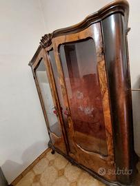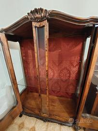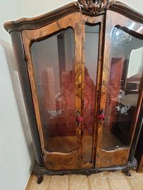 Vetrinetta in radica con vetri decorati, schienale rivestito in tessuto decorato, serrature con chiavi. Mancante di un ripiano in vetro.