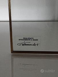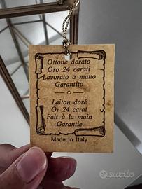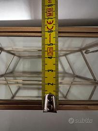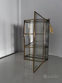 Elegante vetrinetta espositiva in vetro con struttura in ottone dorato, rifinita con cura artigianale. Dotata di sportello frontale apribile e ripiani interni, è perfetta per valorizzare piccoli oggetti, profumi, gioielli o collezioni. 📏 Dimensioni: •Larghezza: 20 cm •Altezza: 29 cm 🔸 Struttura in ottone dorato (placcatura oro 24 carati) 🔸 Lavorazione artigianale – Made in Italy 🔸 Vetro su tutti i lati per massima visibilità 🔸 Design raffinato, ideale per arredamenti classici o moderni Elegante vetrinetta vintage da parete, risalente agli anni ’70/’80, realizzata in vetro trasparente e struttura in metallo color ottone. Dotata di sportello frontale con chiusura a catenella e due ripiani interni in vetro. Sul retro sono presenti i ganci per l’appensione a muro. Linee pulite e stile retrò, ideale come vetrinetta espositiva per profumi, gioielli, oggetti decorativi, collezioni o come elemento d’arredo per bagno, ingresso o soggiorno. Perfetta anche come idea regalo o elemento decorativo per casa, negozio o vetrina.