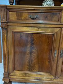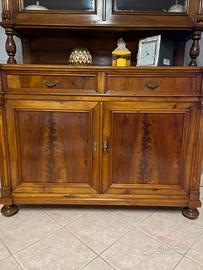 Sopra la vetrina con due ante, poi uno spazio di appoggio e sotto due cassetti e un mobiletto con due ante, largo e profondo.