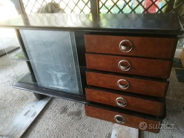REGALO credenza in palissandro nero stile liberty (primi '900) con cassetti ,vetrina in vetro lavorato e specchio di uguale Lunghezza e con altezza 25.cm da applicare nella parte posteriore Misure: H 92 cm L 168 cm P 60 cm