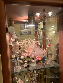 Vetrinetta in noce, anta e fianchi in vetro, fondo a specchio, con luce interna.