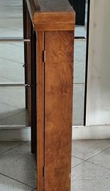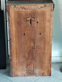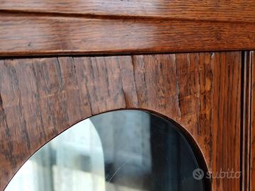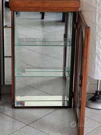 Vetrinetta pensile da esposizione, in legno massiccio - Stile Arte Povera - Buone Condizioni Vendesi bellissima vetrinetta espositiva da parete in legno, in Buone condizioni generali, ideale per collezionismo o per arredare con un tocco rustico. • Struttura Eccellente: Il legno è sano e liscio al tatto. Costruzione artigianale con la caratteristica lavorazione a tasselli accostati sopra l'arco. • Finitura: Stile arte povera, con il "cappello" superiore lasciato al naturale (opaco) come da tradizione. • Interni: 3 ripiani in vetro originali e fondo a specchio (integro, solo da pulire). • Estetica: Anta con vetro sagomato, completa di chiave originale che funge da elegante pomello per l'apertura (la serratura è decorativa, l'anta rimane perfettamente accostata ma non si blocca a chiave). • Montaggio e Solidità: Il mobile è in legno massiccio e ha un peso consistente che ne testimonia la qualità. Il pannello posteriore è stato rinforzato/stuccato (in basso al centro) a seguito dello smontaggio della staffa originale. Questo non pregiudica assolutamente la struttura. La vetrina è pronta per essere appesa tramite i suoi ganci originali, ma data la robustezza e il peso, si consiglia l'utilizzo di tasselli a muro adeguati (non semplici chiodi) per garantire la massima stabilità. • Nota di Trasparenza: Un graffio superficiale sul vetro superiore evidenziato in foto per correttezza, ma quasi invisibile nell'esposizione normale. • Dimensioni: Altezza 77 cm | Larghezza 43 cm | Profondità 13,5 cm RITIRO ESCLUSIVAMENTE A MANO A PIACENZA 80€ # vetrina bacheca
