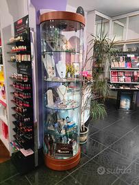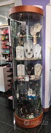 Vendesi vetrinetta da negozio x esposizione bigiotteria base e cielino finitura nero e ciliegio, interno base a specchio, 4 ripiani da diametro cm 52 , distanza tra i ripiani cm 32 , illuminazione a 4 faretti alogeni, 6 ruote, antina con serratura.Sistema brevettato anti polvere e anticalcare. Completa di impianto elettrico. Diametro cm 55 X 190 .