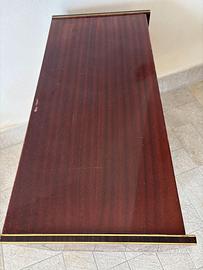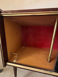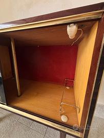 Vetrinetta porta liquori vintage anni '60-'70, con ruote, vetri decorati (uno dorato, uno trasparente), rivestimento in formica con cornici oro. Fondo interno in tessuto, predisposta per illuminazione. Misure: 85x40x75 cm. Buone condizioni generali, nessun grosso difetto. Ideale per angolo bar retrò o arredo vintag