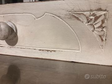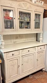 Vetrinetta shabby chic in legno massello, dipinta in tonalità crema chiara. Pezzo unico con intagli decorativi, vetri lavorati e ripiani ideali per esporre servizi, libri o oggetti decorativi. Condizioni molto buone, stabile e ben tenuta. La parte superiore ha tre ante in vetro, mentre la base offre cassetti e sportelli capienti. Perfetta per salotto, cucina country, ingresso o studio. La vendo perché sto rinnovando l’arredamento. Ritiro a casale monferrato e zone vicine. Capiente misura: 140x60 h. 215