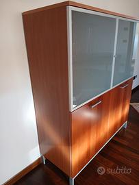 Vendo causa cambio arredamento vetrinetta finitura in ciliegio con porte in vetro cristallo e profili acciaio satinato. Internamente ci sono 2 ripiani in vetro cristallo e 2 in legno. Dimensioni: larghezza 120 altezza 142 profondità 45 . Stato in ottime condizioni