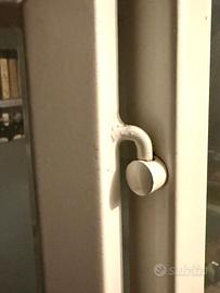 Struttura in ferro verniciata di bianco con pochi punti di ruggine, fianchi laterali e ante in vetro, chiusura con chiave difettosa,