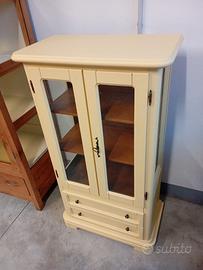 Misure : Altezza 128.5. Ampiezza 39Lunghezza 71. Elegante vetrina vintage dal colore giallo tenue, perfetta per aggiungere un tocco di stile retrò alla tua casa. Le ante in vetro permettono di esporre oggetti da collezione o decorazioni.