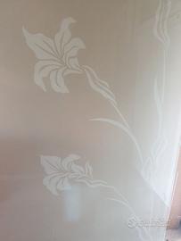 Vetro con incisione a laser di fiori tipo gigli, satinato di un buon spessore, temperato, compreso di ganci per il fissaggio a parete e sopra ad un piccolo muretto. Il prezzo è trattabile. Per qualsiasi informazione o se interessati contattare.