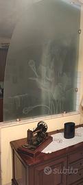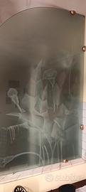Vetro a forma di vela infrangibile,con disegno centrale fiori Kalle lavorato a mano artigianale, bellissimo come nuovo,mis. base 134 cm., altezza 178, spessore vetro 1 cm.,vendo causa modifiche ristrutturazione casa, smontaggio e trasporto a carico dell'acquirente.
