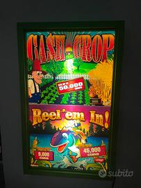 In vendita raro pannello frontale originale proveniente da una slot machine WMS Gaming, con grafica iconica “Cash Crop” (tema agricolo) e “Reel’em In!” (tema pesca).