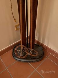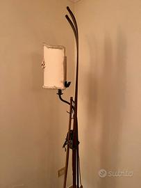 L’Anima del Pezzo: La struttura portante è composta da una coppia di autentici sci d’epoca in legno massiccio, completi dei loro attacchi originali in metallo e cuoio, che conservano intatta la patina del tempo. Ad accompagnarli, eleganti racchette in bambù con rotelle vintage, che conferiscono alla lampada una linea slanciata e armoniosa.
