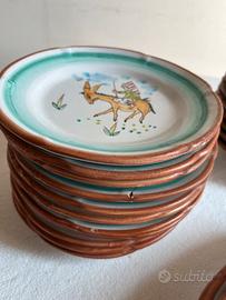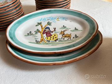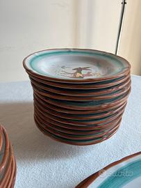 Solimene, Vietri, servizio di piatti dipinto a mano così composto: 12 piatti piani 12 piatti fondi 9 piattini da frutta 6 piatti da zuppa 6 piatti ovali Quattro piatti grandi da portata Due piatti grandi ovali da portata