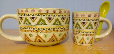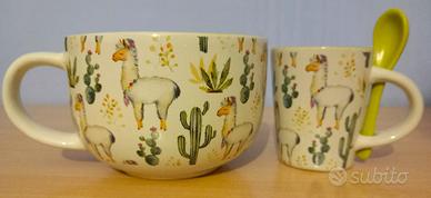 Con la linea Lamalima il fascino esotico d’ispirazione sudamericana fa capolino sulla tavola Villa d’Este. L’atmosfera diventa leggera: il simbolismo pop del lama si abbina al tipico decoro tessile peruviano che ci riconduce alla tradizione ( In gres , Decoro lama, Interno verde, Misure: Ø 11,5 x h. 7,5 cm, Capacità: 415 ml, Lavabile in lavastoviglie , Utilizzabile in microonde Capacità Lt 0,4 ) + le due tazzine da caffè della stessa linea ( In gres, Con cucchiaino verde, Misure: Ø 5,8 x h. 7 cm, Cucchiaino: l. 9 cm Capacità: 90 ml )