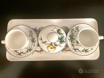 Servizio da caffè originale Villeroy & Boch linea Botanica. Set completo per 2 persone composto da: – 2 tazzine con piattini – zuccheriera con coperchio – vassoio coordinato Tutti i pezzi in ottime condizioni, senza crepe o sbeccature. La linea Botanica è molto apprezzata per le decorazioni floreali con nome botanico, ideale sia per utilizzo che come oggetto decorativo.