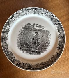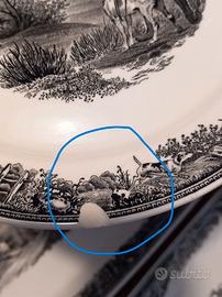 Collezione Artemis, anni ‘50/’60, manifattura tedesca, calcografia su lastra rame applicata sotto smalto. Motivo: scena caccia tradizionali. Monocromatico nero su bianco/crema. Prestigioso servizio completo per 10 persone, per un totale di 40 pezzi così suddivisi: •Piatti fondi – 10 pezzi •Piatti piani – 20 pezzi •Piattini dessert – 10 pezzi Nel suo assieme, il set appare in ottime condizioni: si notano due scheggiature come da foto (su un piatto piano ed uno da dessert) ed alcune macchie del tempo coerenti con l’età ed il materiale. Naturalmente disponibile a fornire ulteriori dettagli, foto e/o dimensioni dei componenti. Combinabile con SET ACCESSORI (vedi inserzione, stesso account). INFO per la SPEDIZIONE. Le dimensioni totali (approssimative) sono: 30x60x60 cm, 15 kg. Se ritiro a mano, la zona principale di riferimento è Roma Sud (Eur).