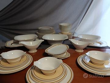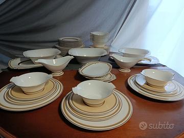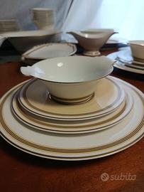 Servizio piatti Vivian Gold Villeroy & Bosch. Caratterizzato dal bordo oro. Servizio di piatti per 12 persone, come nuovo. Comprende 12 piatti grandi diametro 28 cm 12 piatti antipasto 22cm 12 sottopiatti 20cm 12 coppette per zuppe o dessert o macedonie 4 vassoi piccoli 25cmx17cm 2 vassoi grandi 38cmx25cm 1 zuppiera grande 30cmx26cm 2 zuppiere medie 25cmx 22cm 2 salsiere 24cmx12cm