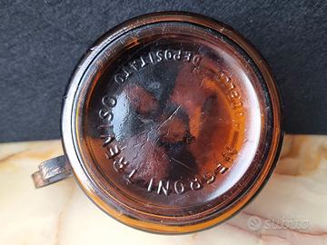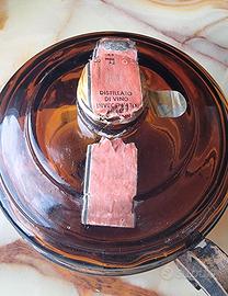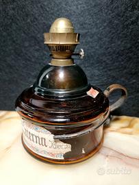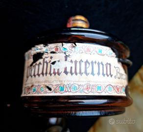 Oggetto da collezione, decorazione, vintage vintage 1920-50— bottiglia "Vecchia Lucerna Brandy" per vino e lanterna, Italia Un oggetto vintage molto insolito e raro con una storia, approssimativamente 1920-1950 (Italia). L'oggetto sembra un ibrido: una bottiglia originale in vetro ambrato spesso con le etichette originali conservate: un bollo di accisa e un'etichetta di un distillato di vino della NEGRONI, Treviso + supporti metallici per una lampada a cherosene con portalampada e bruciatore in metallo. Si tratta di una combinazione unica: una bottiglia di vino funzionale e una lampada a cherosene in un unico oggetto. Questa pratica era comune in passato: nulla veniva buttato via. Ma la parte più interessante e da collezione sono le etichette sopravvissute. La grande etichetta riporta ancora: "Vecchia Lucerna Brandy", di G. e C. s. n. c. di Treviso, "3 years of wine distillation", "PURO DISTILLATO DI VINO prodotto e imbottigliato dalle Distillerie NEGRONI." L'etichetta di accisa reca il timbro "Republica Italiana", "Imposta fabricazionedi distillato di vino da litri 3/4, 0.395 seria FF, N.....46, distillato di vino invecchiato di...anni." La bottiglia è stata aperta e conteneva effettivamente del vino, a dimostrazione che l'oggetto era nelle sue condizioni originali. Ora la bottiglia è vuota e può essere trasportata e riutilizzata in interni. Adatta per: arredamento d'atmosfera (loft / rustico / industriale), da collezione. Un oggetto storico dei primi del XIX secolo, una decorazione unica per un bar o un wine corner, un regalo insolito con una storia. Condizioni: buone condizioni vintage. Sono presenti segni di usura sull'etichetta e sulle parti metalliche, che aggiungono fascino e sono tipici di un oggetto vintage di questa età. 📏 640 g, altezza - 18 cm, diametro - 13 cm, lunghezza con manico - 17 cm