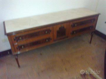 1 Comò con piedini e Piano di marmo Rosa del Portogallo, con 4 cassettoni, 1 ribalta con scrigno porta gioie interno da cm.210 x 50 x 80 rivestito in velluto rosso;