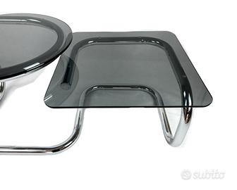 Struttura in metallo cromato con due piani in vetro sfalsati.