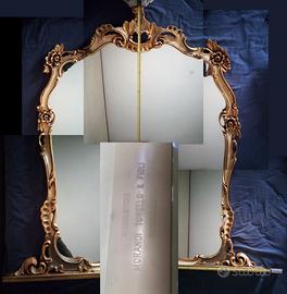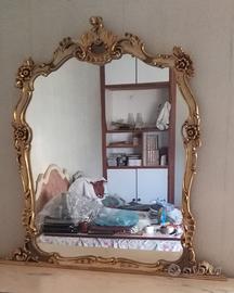 Uno Specchio in cornice lignea scolpita a motivo floreale e finitura indoratura fiorentina (specchio 100x130 cm circa, ingombro Alt. 132 cm. x Largh. 130 cm.) ;