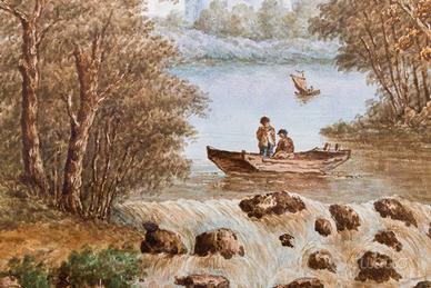 Questa affascinante opera d'arte vintage presenta una scena in ceramica ambientata in un tranquillo ambiente pastorale, probabilmente ispirato ai paesaggi tradizionali. Due figure in una piccola barca scivolano lungo un fiume circondato da alberi rigogliosi, mentre altri piccoli dettagli, come un pescatore in riva al fiume, aggiungono un tocco di vita alla scena. L'opera è incorniciata in una cornice di legno rivestita in tessuto con delicati dettagli dorati agli angoli, che aggiungono una finitura elegante e rustica.