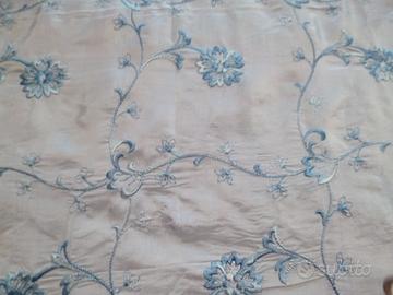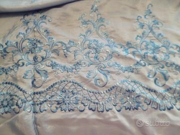 Copriletto vintage anni 50. celeste con ricami in una tonalita piu scura. Misure 1.26 x 2.32. letto matrimoniale misura francese.. anche per eventuale tendaggio. Anni 50. su tre lati rifinitura in passamaneria celeste. Molto elegante. Prezzo 30 piu eventuale costo spedizione. Contattare Marella 338 933 2344