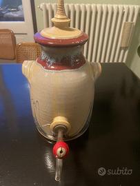 Distributore di bevande in ceramica francese d'epoca, fatto e dipinto a mano con disegno stile Decò, con coperchio e due piccole maniglie laterali. Tappo originale in sughero con rubinetto in vetro sul fondo (rimovibile). Può essere utilizzato per qualsiasi scopo - vino, acqua, bevande in generale. Ottimo per tenere bevande freschi d'estate. Ben fatto, resistente e dal colore molto gradevole.