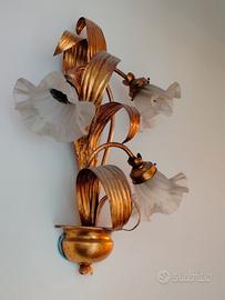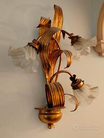 Vendo elegante set coordinato di lampade in stile classico/floreale, realizzate in metallo lavorato con finitura in foglia oro e diffusori in vetro satinato a forma di calla. il set è composto da: 1 Lampadario a sospensione con 5 punti luce e decorazioni a foglie lunghe. 2 Applique da parete abbinate a 3 punti luce ciascuna.