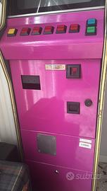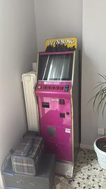 Macchinetta da gioco vintage, slot machine veneziana. In ottime condizioni, presenta qualche graffio ma nulla che tolga alla sua estetica suggestiva. Funzionante a lire, con cavi di alimentazione originali. Rotelline posteriori nascoste, per trasporto facilitato.