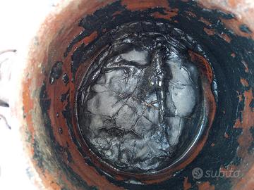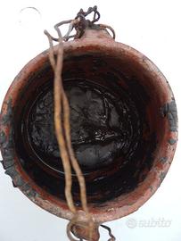 Raro pentolino in terracotta usato agli inizi del '900 per liquefare la pece. Questa fungeva da sigillante per gli innesti ed i tagli di potatura, al pari del moderno mastice. Il pentolino presenta, all'esterno vistose tracce di colatura ed all'interno un residuo secco di pece. Il fil di ferro che congiunge i due manici, per facilitarne la presa a caldo negli spostamenti, può essere facilmente asportato. Dimensioni: diametro bocca cm. 13, altezza cm. 12.