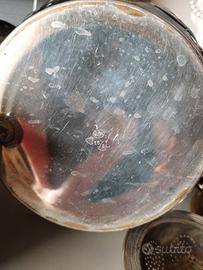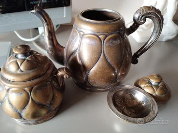 coppia di teiera e zuccheriera con filtro,in ottone placcato ( ora consumato il rivestimento), contrassegnate con marchio WUMAK , probabile anni 20 , Germania.entrambe hanno dei piccoli coperchi. lavorazione con gocce alte e basse.Dimensioni :la teiera:diametro inferiore 11 x 18 cm altezza. La zuccheriera :diametro 10x 12 cm altezza. Nella teiera il punto di raccordo tra la parete e il fondo non è più a tenuta stagna per un paio di cm ,per cui l 'oggetto se riempito perde acqua e può essere usato come arredo (oppure riparato). Oggetti molto belli ,di lavorazione artigianale. peso di tutti i pezzi: 760 grammi