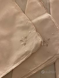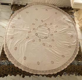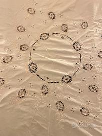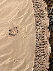 VINTAGE ANNI '50 - TOVAGLIA ROTONDA COLOR ECRU CHIARO DI COTONE CON IL CONTORNO DI PIZZO LAVORATO A UNCINETTO - SULLA TOVAGLIA SONO INSERITI FIORI A UNCINETTO CON CONTORNO RICAMATO A MANO CHE FORMANO GIRASOLI - IL RICAMO A MANO CONTINUA POI CON ALTRI DISEGNI (SIA IL BORDO CHE I RICAMI SONO TUTTI IN TINTA) - N. 6 TOVAGLIOLI CON CONTORNO A MANO A PUNTO FESTONE E UN FIORELLINO RICAMATO A MANO SU UN ANGOLO - USATA QUALCHE VOLTA - OTTIME CONDIZIONI - DIAMETRO (COMPRESO IL PIZZO) CM 168 MISURE TOVAGLIOLI CM 40 X CM 40