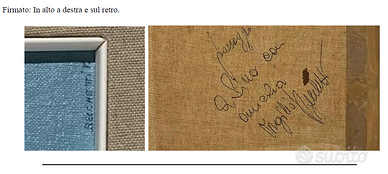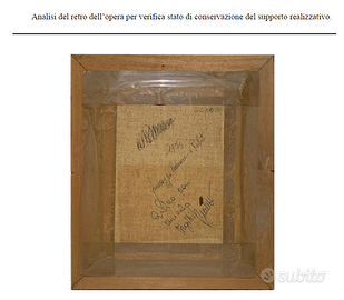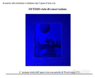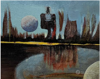 Quest’opera si presenta come una composizione pittorica di forte impatto visivo, sospesa tra suggestioni oniriche e visioni spaziali. Il dipinto, eseguito a olio su tela, è firmato e datato in alto a destra e sul retro da Virgilio Becchetti. Quest’opera, realizzata nel 1976, si distingue per un linguaggio pittorico di matrice surrealista e visionaria. Il soggetto è dominato da tre sfere sospese in un cielo azzurro: forme planetarie che evocano un paesaggio alieno, o un cosmo mentale. In basso, una figura antropomorfa stilizzata, scura e enigmatica, si staglia al centro della composizione. La parte inferiore della scena presenta un bacino d’acqua che riflette parte dell’ambiente circostante, accentuando la dimensione metafisica del dipinto. Gli elementi verticali che affiorano sullo sfondo, simili a stalagmiti o lingue di fiamma, contribuiscono a creare un’atmosfera sospesa e rarefatta, come in un sogno. Lo stile pittorico dell’artista si avvicina, per temi e impostazione, alla corrente del realismo magico e del surrealismo tardonovecentesco. La pennellata è nitida, stesa con precisione, e i colori appaiono smaltati e freddi, creando un effetto quasi fotografico. Si nota un’attenzione particolare alla resa della luce e delle superfici, soprattutto nelle sfere e nei riflessi sull’acqua. La composizione, benché essenziale, è ben equilibrata e suggerisce una visione interiore piuttosto che naturalistica. L'opera richiama suggestioni di artisti come Yves Tanguy, Giorgio de Chirico o i paesaggi immaginari di Ernst, pur mantenendo una cifra originale. La qualità pittorica e la datazione precisa (1976) collocano l’opera all’interno del contesto artistico italiano post-surrealista, in un periodo in cui si assiste a un ritorno alla pittura figurativa d’atmosfera, spesso con contenuti simbolici ed esistenziali.