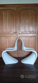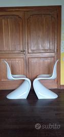 VITRA coppia di VERNER Panton Classic Chair S. Opera del grande design danese VERNE PANTON. Produzione Vitra in resina RIGIDA POLIURETANICA by FIBERGLASS in Finitura superficiale esterna Bianco laccata lucida . ECCELLENTE STATO. Tenute come puro OGGETTO di arredo presso nostro negozio. Segni minimi. Impercettibili. Presenti solo sulla parte bassa della superficie della sedia a contatto con pavimento. Per il resto sono Perfette. Prezzo del nuovo per una Panton Classic Chair S in FIBERGLASS laccata lucida è di 1640 euro. Alla Pagina dello shop VITRA.