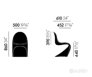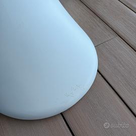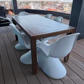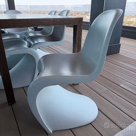 Vitra – Sedia Panton bianco; Concepita da Verner Panton nel 1960, la sedia Panton è stata sviluppata per la produzione in serie in collaborazione con Vitra (1967). Oggi, la sedia interamente in plastica è un’icona del design del XX secolo. Ha ricevuto numerosi premi internazionali di design ed è presente nelle collezioni di molti importanti musei. Materiale: Polipropilene colorato in massa. 100% riciclabile. Finitura opaca. Adatto per uso esterno. Prezzo 200€ per sedia singola. 1000€ per tutte 6.