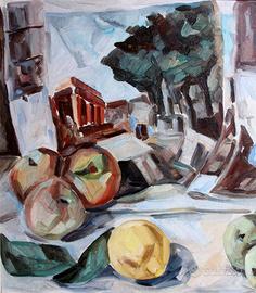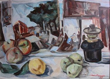 NATURA MORTA CON MELE LUME E PAESAGGIO DI QUESTO PITTORE MOLISANO NATO NEL SECOLO SCORSO.