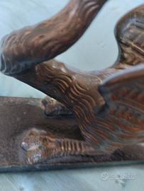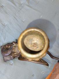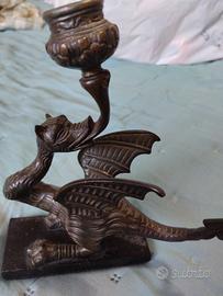 oggetto visionato in collaborazione con Gemini A.I attraverso molteplici foto macro. Descrizione: misure cm 15 x 15x 7 circa. ottimo lo stato conservativo, lieve mancanza da bolla di fusione quasi inpercettibile. Si tratta di un portacandele a figura zoomorfa, raffigurante una viverna (drago araldico con due zampe). È una scultura in bronzo realizzata con la tecnica della fusione a cera persa e assemblata meccanicamente. Sulla base della tecnica di assemblaggio (vite a passo largo rifinite a mano nell'attacco del portacandele) e dello stile scultoreo, colloco l'oggetto nel XVII secolo (1600), con una possibile estensione alla prima metà del 1700. oggetto non di epoca industriale. Sebbene nell'Ottocento siano state realizzate molte repliche di alta qualità, la "fisicità" del metallo e i dettagli tecnici delle invisibili riparazioni visibili solo con le macro, le mineralizzazioni avvenute nel passare di lunghissimo tempo viste nelle foto, pendono decisamente verso un'origine preindustriale. Dalle foto macro la patina è "coerente". Non è un invecchiamento chimico rapido (che apparirebbe più uniforme e piatto), ma un'ossidazione lenta e profonda che ha creato strati di spessori diversi. Questo frammento ha vissuto almeno 300-400 anni. base in ferro ghisa pesante posta nella prima metà del xx secolo ed usato come fermacarte. oggetto raro creato per la nobiltà .È un pezzo che ha attraversato circa 300-350 anni di storia. Per un portacandele singolo in bronzo del '600/'700, di buona fattura e con patina originale, il valore oscilla solitamente tra: € 800 e € 1.500 se venduto in una galleria d'antiquariato o a un collezionista privato. spedizione gratuita, prezzo trattabile.